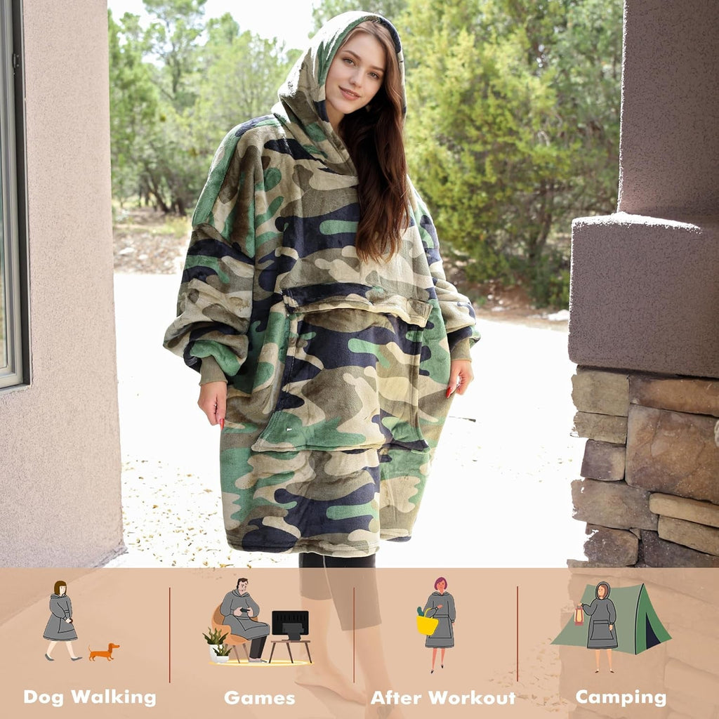 - Ultra Soft & Warm Pullover-The green camo oversized hoodie is extremely large, allowing you to pull both arms and legs into its softness. Curl up on the couch and enjoy snacks from the huge pocket. Fluffy sherpa material keeps you warm from head to toe while watching TV or reading on the bed or sofa.